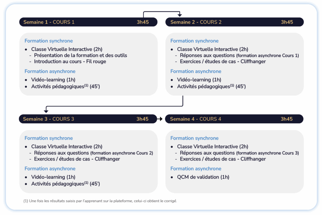 - Chaque compétence est mesurée par des évaluations formatives (cas pratiques, exercices) tout au long de la formation.