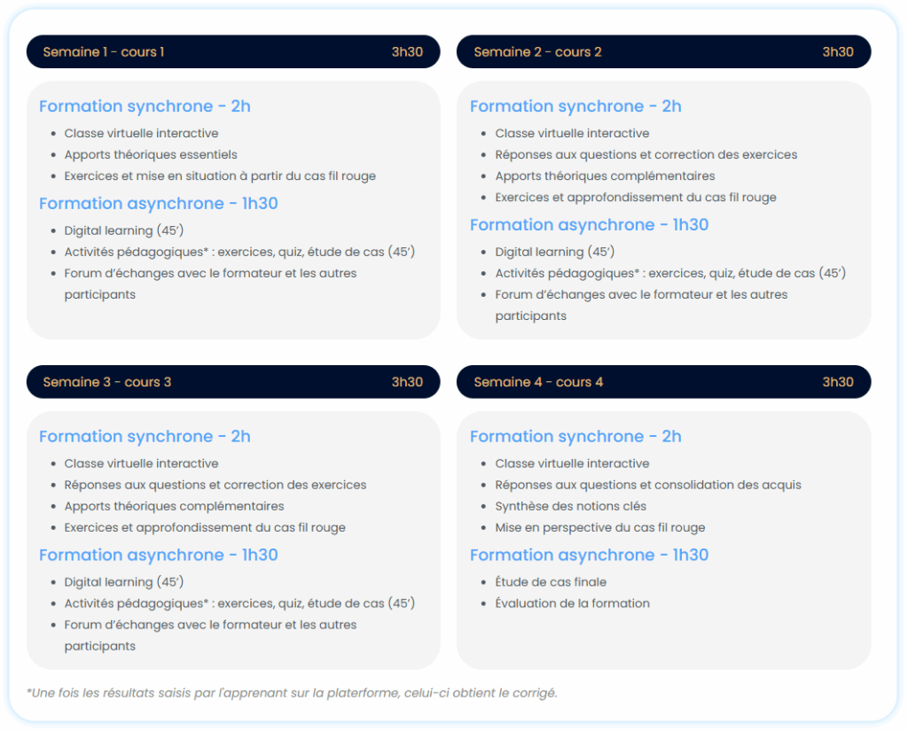 - Chaque compétence est mesurée par des évaluations formatives (cas pratiques, exercices) tout au long de la formation.