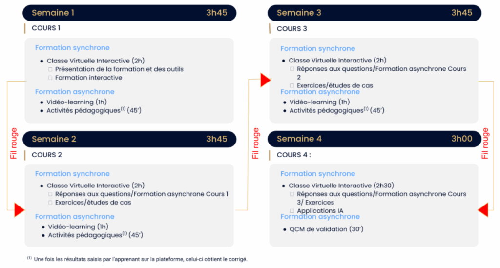 - Chaque compétence est mesurée par des évaluations formatives (cas pratiques, exercices) tout au long de la formation.