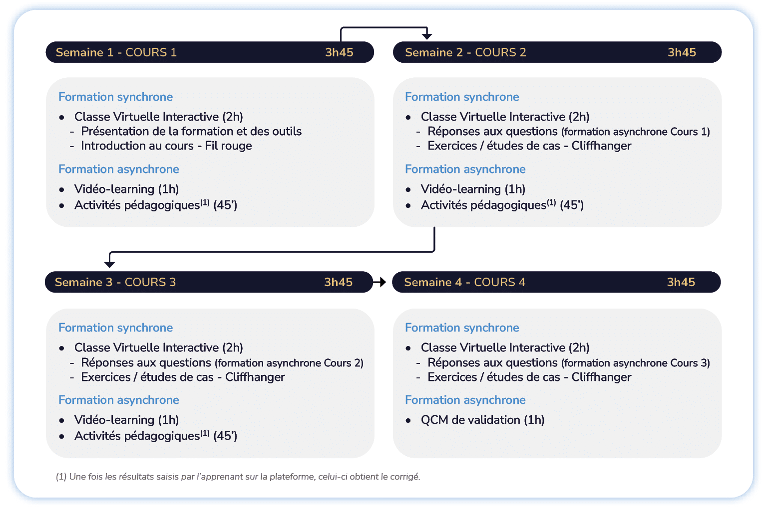 | FormaFlex® | 14h (4 modules sur 4 semaines) | Classe inversée Classe virtuelle interactive + digital learning Module de formation IA intégré Études de cas, suivi individualisé | Attestation de réussite |